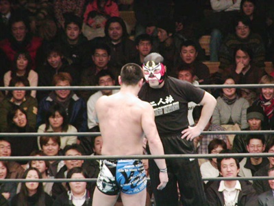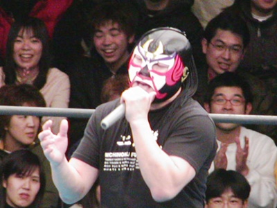 「今日はセパラードス歌いませんでしたが、今年前半に新曲出します。キングレコードから、発売日未定。」でも結局「セパラードス」アカペラで歌う羽目に(右写真)。「10年前よりマシだな。新曲期待してください。みなさんが一人でもいる限り、みちのくプロレスは永遠に不滅だ!」