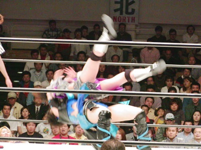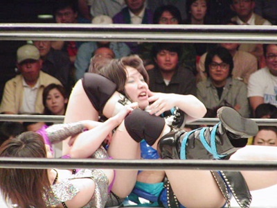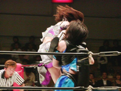 日向みちドラ狙う、田村ブロックしてコブラクラッチスープレックス(右写真)2連発、カウント2。