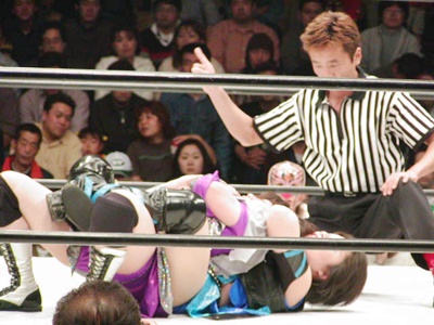 田村スリーパー(右写真)、日向ロープ。田村はロープ越しにドラゴンスリーパー、レフェリーがブレーク。