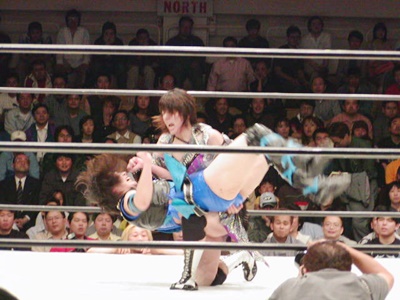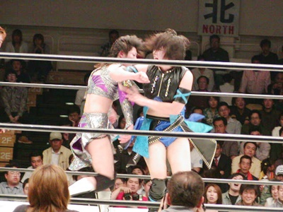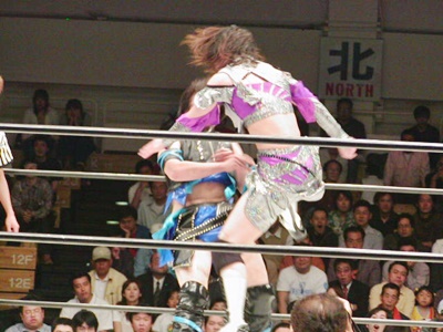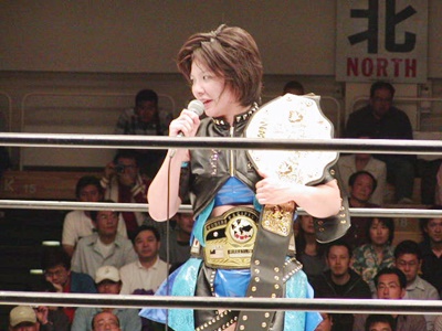 現二冠王・日向あずみ(左写真)。日向と田村のシングル戦は4年ぶり3度目、ここまでの対戦成績は1勝1敗とのこと。この時か。そんなにやってないとは意外(ちなみに1回目は96年5月の第1回ジュニアオールスター)。