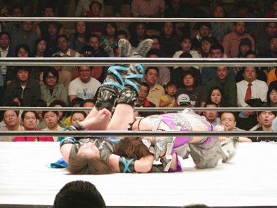 日向は田村をリングに戻すと逆エビ固め(左写真)から逆片エビ固め、日向のこの人殺しかねないような(というのは例えが悪いか)集中力あふれる顔つきがよい。田村なんとかロープエスケープ。