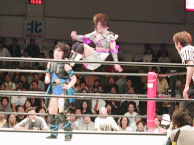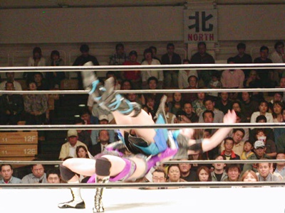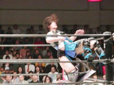 田村ダブルリストアームサルト、日向身を翻して着地、飛びついてコルバタのように回転してDDTに。日向コーナーに上ってミサイルキック、田村寸前でかわす。田村ロープに振る、日向切り返してDDT、カウント2。日向バック取る、田村エルボーでブレーク、ヒザ蹴り入れてダブルリストアームサルト(右写真)2連発、いずれもカウントは2。