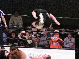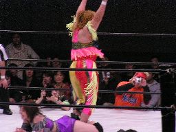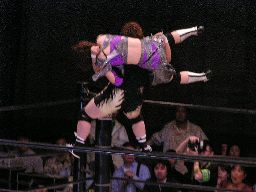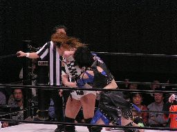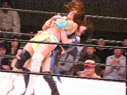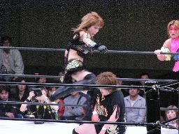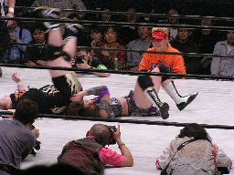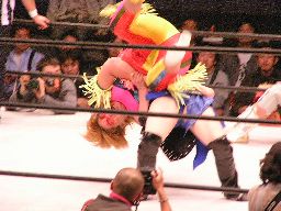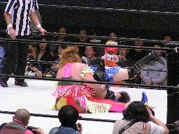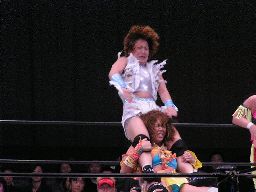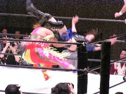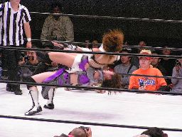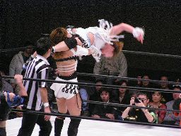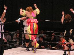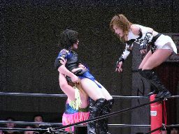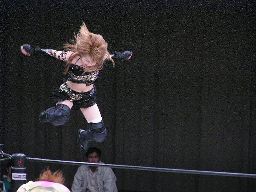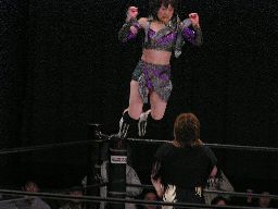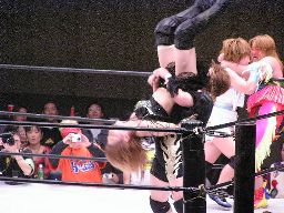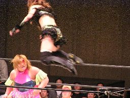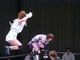 日向コーナーに上る、伊藤雪崩式バックフリップ(右写真)、カウント2。伊藤トルネードボム打って京子にタッチ。