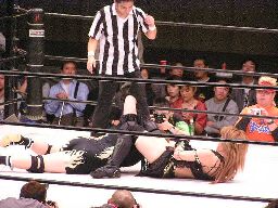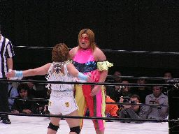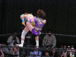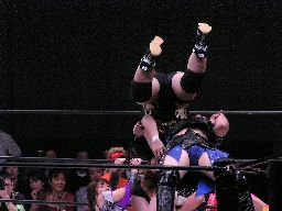 日向が貴子にロコモーションジャーマン(右写真)、カウントは2。日向延髄ニー、貴子かわして裏拳、中西カット。貴子は三田にタッチ。