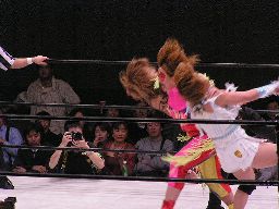 京子がかついで貴子が合体ノド輪(右写真)、カウント2。京子ナイアガラドライバー狙う、田村着地して裏ダブルリストアームサルト、カウント2。