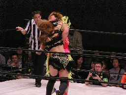 京子リングに入るとまずカバー、日向2で返す。京子ダンシングツリー(左写真)。リリースしてキャメルクラッチ、ものすごい反り方。さらに貴子が入ってキック。田村がカットに。京子コーナーに振る、日向またもコーナー飛び乗り失敗。京子背中にパンチ連打。京子ジャーマン、日向空中回転して着地。15分経過。