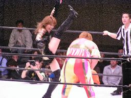 大向延髄ニー、かわされる(左写真)。京子投げっ放しジャーマン、伊藤にタッチ。