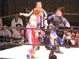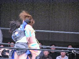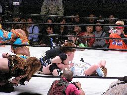 大向ロープに振る、三田ブレイジングチョップで返して貴子にタッチ。大向は中西を呼び込んでダブルのキックからダブルのクローズライン狙うが貴子かわし、入ってきた京子が2人にラリアット(左写真)。貴子と京子がダブルのDDT。大向がロープに近寄ったところを田村が背中に強制タッチ。
