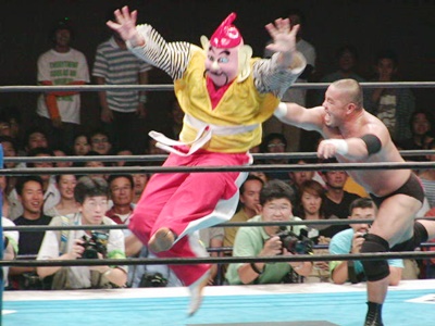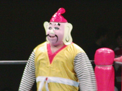外道はえべっさんのマスクにかみつく。鼻にエルボースタッブ、ナックル、マスクはぎ(左写真)、チョーク攻撃、顔面ストンピングとやり放題。5分経過。
