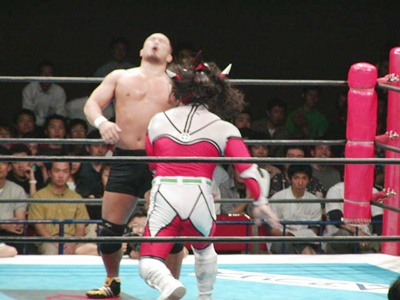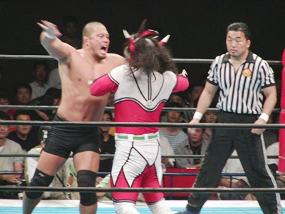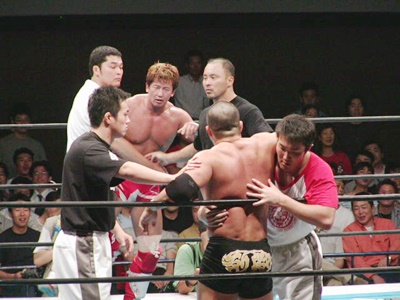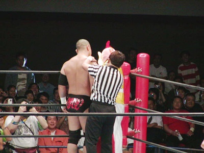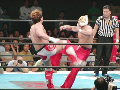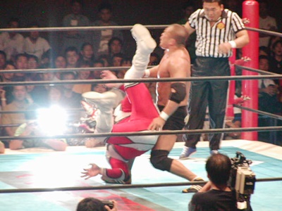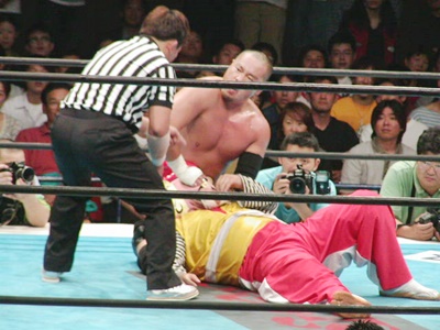 タイガードライバー(左写真)、カウント2。タイガー金本の腕にストンピング、キック連打。金本「もっと蹴れ!」と強がる。