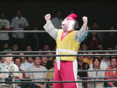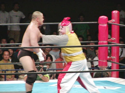 えべっさんがリングに戻るとチョップ合戦(右写真)、ロープワークからえべっさんドロップキック、外道場外転落。えべっさん飛ぶ振りのみでポーズ。えべっさん場外に外道を追う。外道トラースキック、フェンス、鉄柱、エプロンにぶつけてえべっさんをリングに戻す。