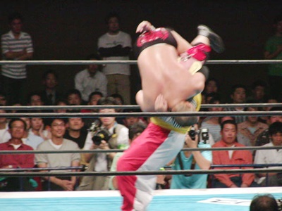 ライガーもう一発垂直落下狙う、杉浦ブロックしてオリンピック予選スラム(左写真)、カウント2。10分経過。