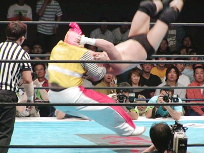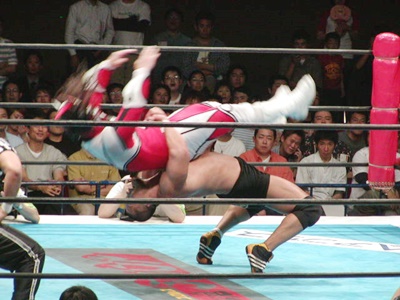 杉浦コーナーに振って串刺しスピアー、そのまま胴タックルで持ち上げると水車落とし(左写真)、カウント2。