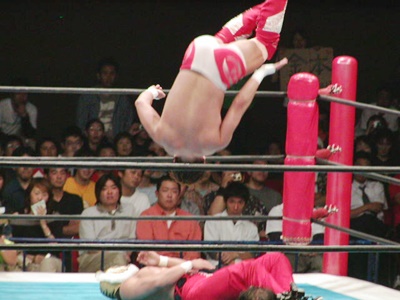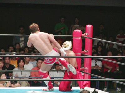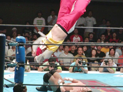 タイガーは金本の足にキック、コーナーに詰めてジャブ2発からローリングソバット。コーナーに上げて雪崩式ダブルアームスープレックス狙うが金本ブロックしてタイガーを突き落とす。タイガー下からドロップキック、金本を場外に落としプランチャ(左写真)、金本かわす。金本タイガーの顔面にキック入れてリングに戻る。