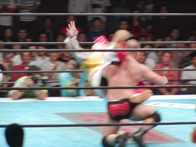 タイガーもリングに戻る、金本ミドルキック、タイガーかわしてハイキック。コーナーに上げて雪崩式ブレーンバスター(右写真)からその場跳びムーンサルトニードロップ、カウント2。