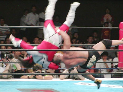 ライガーはパワーボム(右写真)、カウント2。垂直落下ブレーンバスター、杉浦2で返す。