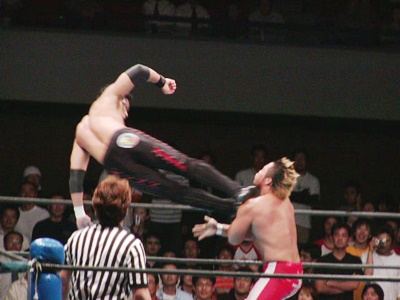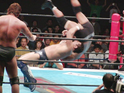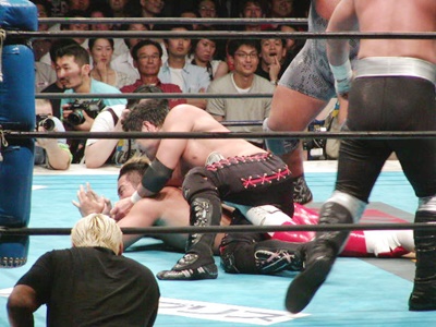 吉江ブレーンバスター、天山ブロックして逆に投げようとする、吉江ブロック。掛け合いは結局吉江が天山を投げる(右写真)。カバー、カウント2。吉江ボディスラム、棚橋にタッチ。吉江と棚橋ダブルのストンピング、棚橋ニースタンプ落としてカバー、カウント2。スリーパーに取るが天山はサミングでブレーク、急所目掛けてニースタンプ。天山キック、AKIRAにタッチ。AKIRAもキック、ボディスラムからサードロープに棚橋の足を引っ掛けてヒップドロップ。5分経過。