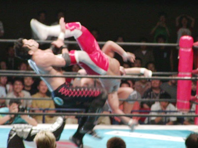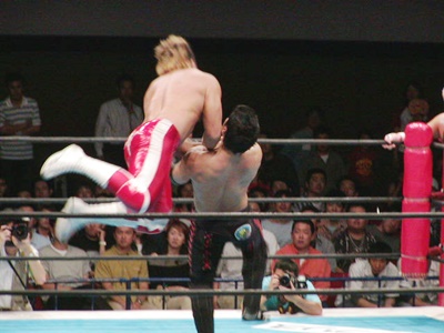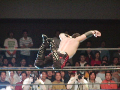 棚橋ヘッドロック、AKIRAロープに振る、棚橋ショルダーブロック。棚橋ロープに飛ぶ、AKIRAリープフロッグでかわしてドロップキック、棚橋場外転落。棚橋エプロンに戻る、AKIRAが突っ込む、棚橋エルボー、ロープに振ってフライングエルボー(右写真)からジャンプしてエルボードロップ。天山を挑発する。AKIRAは天山にタッチ。天山と棚橋ロックアップ、天山はコーナーに押し込むと吉江を呼び込む。棚橋は吉江にタッチ。