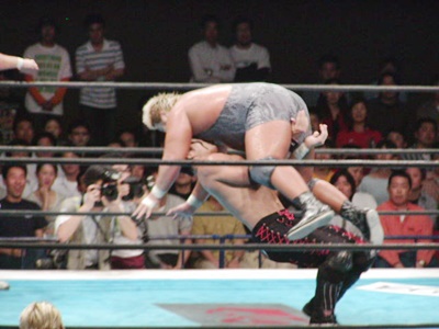 吉江がAKIRAをコーナーに振る、棚橋が串刺しドロップキック、吉江がロープに飛んでテーズプレス(右写真)、ダブルのバックドロップから棚橋がカバー、カウント2。
