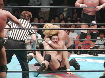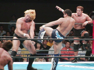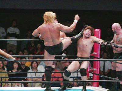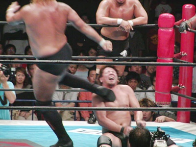 吉江ショルダーブロック、コーナーに振ってスプラッシュ。ロープに振ってテーズプレス、カウント2。肩に担いでアバランシュホールド、カウント2。吉江ロープに飛ぶ、後藤がリングサイドから足引っ張って転ばす。吉江が立ち上がったところに天山ニールキック。天山コーナーに上ってダイビングヘッドバット、吉江かわして棚橋にタッチ。棚橋ドロップキック。天山はAKIRAにタッチ。棚橋はAKIRAにもドロップキック(右写真)、肩に担いでオクラホマスタンピード、カウント2。