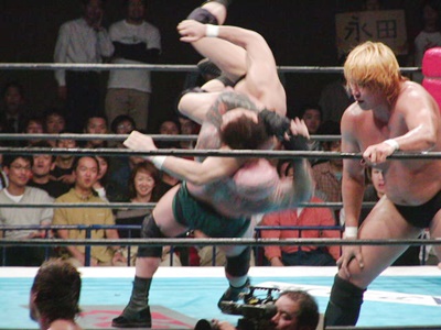 真壁ロープに飛ぶ、永田エルボー打ち込んでエクスプロイダー(右写真)。真壁すぐに立ち上がってスピアー、そしてノーザンライトスープレックス、カウント2。真壁ジャーマン狙う、永田ブロック。真壁エルボー連打、ラリアットからカバー、飯塚カット。真壁コーナーに振って串刺しラリアット、永田かわしてナガタロックIII、山カット。永田は飯塚にタッチ。