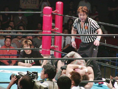 AKIRAコーナーに上って“ムササビ”ダイビングボディプレス(左写真)、吉江がカット。10分経過。