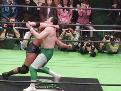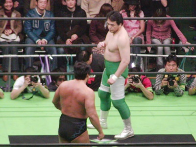 20時23分、試合開始。まずはにらみ合い(左写真)。ロックアップ、小橋がロープに詰める、ケサ斬りチョップに行くが三沢かわす。