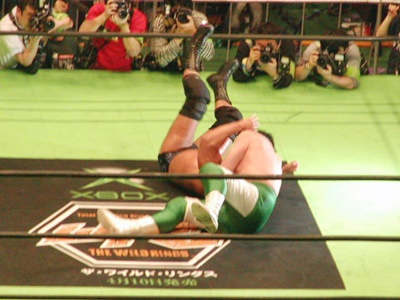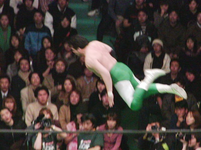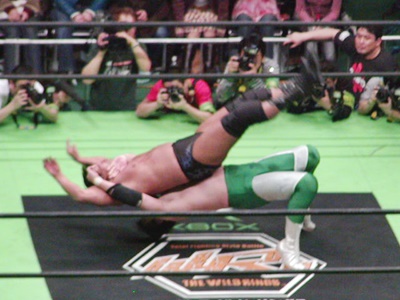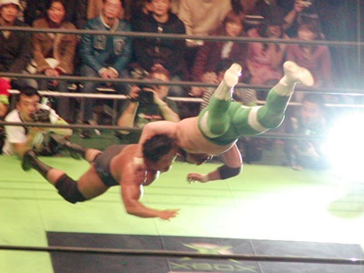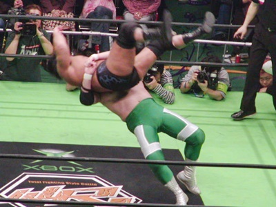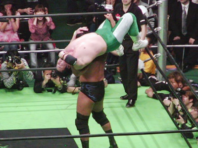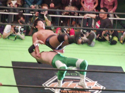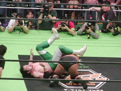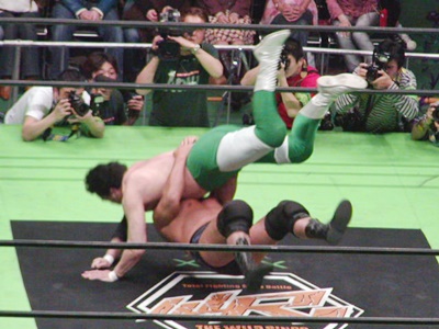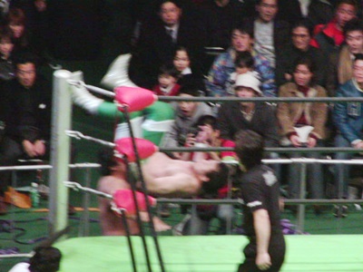 再度ロックアップ、小橋ヘッドロック、三沢ロープに振る、小橋ショルダーブロック。三沢エルボー、ロープに振る、小橋切り返してバックドロップ、三沢体をひねって潰す(右写真)。小橋フライングメイヤー、三沢ヘッドシザーズで切り返す。ブレーク。
