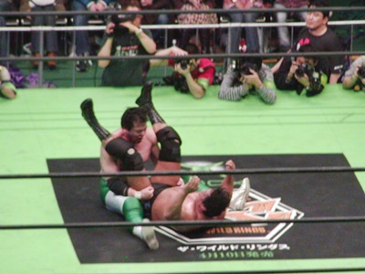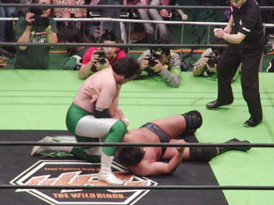 三沢タイガードライバー(左写真)、カウント2。20分経過。