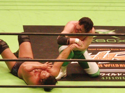 ロックアップ、三沢飛行機投げから腕を固める(左写真)。小橋立ち上がる、三沢ハンマーロックに。小橋切り返す。三沢また切り返す、小橋切り返す、力比べの格好に。三沢がねじ伏せる。小橋上体起こして三沢の腕をひねり上げる。三沢回転してブレーク、小橋ハーフネルソン、三沢ブロック。
