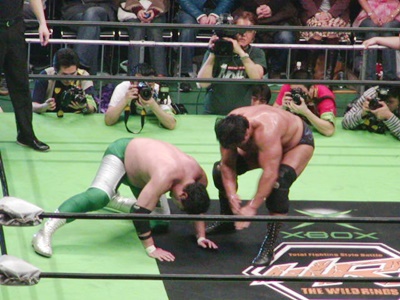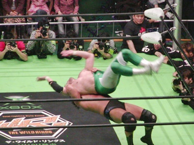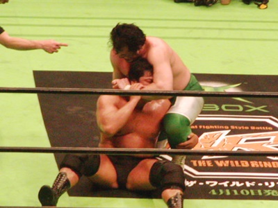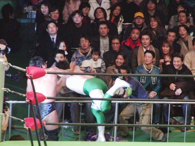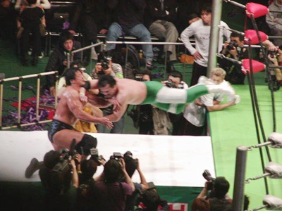 小橋フライングメイヤー、三沢ヘッドシザーズ。小橋再度ヘッドロック、三沢バックドロップに(右写真)。小橋思わず場外エスケープ。