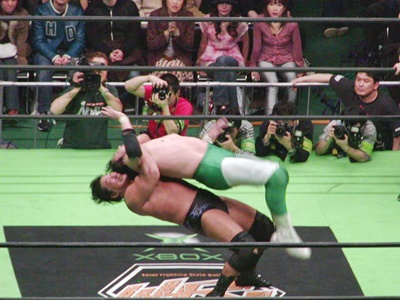 三沢エルボー、ローリングエルボーからエメラルドフロウジョン(左写真)、小橋2で返す。三沢またタイガードライバー狙う、小橋なんとかリバース。