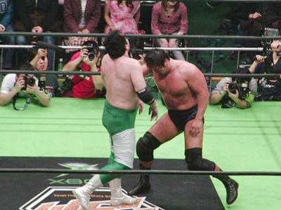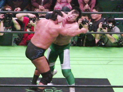 小橋サイドヘッドロック、三沢ロープ。小橋は三沢の肩口にチョップ、三沢エルボーで対抗(左写真)。小橋チョップ連打、ロープに飛んでフェーマサー、カウント2。