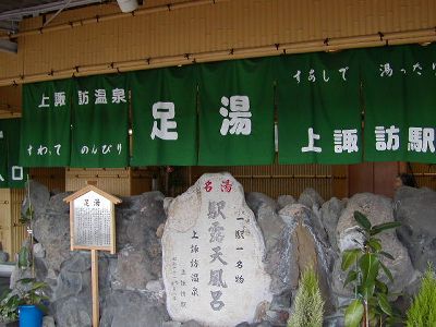 11時に上諏訪駅に戻る。松本行きの普通列車がちょうど出たところ。次のあずさは30分後(普通列車はさらに30分後)、ということで上諏訪駅名物ホームの中の足湯(右写真)に。ここは結構前から「駅のホームにある露天風呂」として有名だったが去年足湯に改装したのだ。足湯の方がめんどくさくなくていいけど。20分近く足を漬けて11時30分発のあずさ(また新型)で松本に。