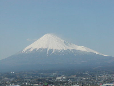 結構ゆっくり回って13時過ぎに城を出る。今日は18時から王子で三四郎メルマガオフ会。それには戻らないといけない(ってこともないが)。しかし午後の東京行きの新幹線指定席はすべて満席。そうだろうなあ、あれだけ人も来てるんだから。新大阪まで行って始発を狙うかそれとも・・・・結局グリーン車を選択。贅沢。昼飯は「播磨春夏秋冬」という幕の内。なかなかこれもうまかった。グリーン車と言っても何が違うってわけじゃないよなあ。席間は多少広いが。静岡辺りからやはり指定席を取れなかったらしい騒がしい親子連れやサラリーマンが席を埋め、何だかやな感じに。しょうがないか。前回の磐梯山に続き帰りの車中から富士山を撮ってみる(右写真)。東京駅には16時過ぎ着。京浜東北線で王子に直行。駅前でもきち夫妻と出くわしたのでそのまま会場の「高砂」に連れて行ってもらう。あんまり「オフ会」という感じでもなかったな。
