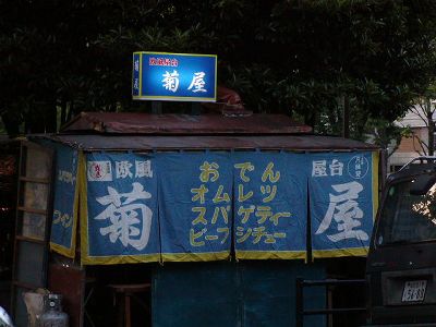そのホテルは博多区・冷泉公園の前。冷泉公園の南側には屋台が6軒。このエリアにはいろいろ変わった屋台が。このメニュー(右写真)は何ですか?