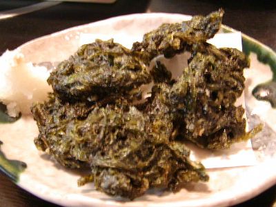 青サノリの天ぷら。「珍味」かと思ったらこれは真剣においしかった。