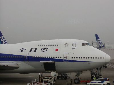 朝4時起き、4時45分に家を出て5時13分発の空港バスで羽田へ。約40分で羽田着。すぐに発券、搭乗口へ。今回はANA(右写真)。6時40分離陸予定が、1人遅れたらしく10分ほど待つことに。
