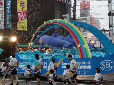 ガマンと言いつつ5000円ほど遣い、また電車に乗って松風町に。夕飯は鮨金総本店で。カウンターの隣に座ってた札幌の広告代理店社員と名乗る長髪のおっさんと話が盛り上がる。ここは寿司は値段表示制だが、つまみを頼むと値段が結構するというシステムのようだ。結構珍しいネタ出してもらったから当然だが。食事終えて大通りに戻るとまだパレードはやってた。まだというかさっきよりクレイジー度が増してる。これ(右写真)なんか電気工事組合が電線マンだし。
