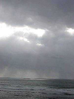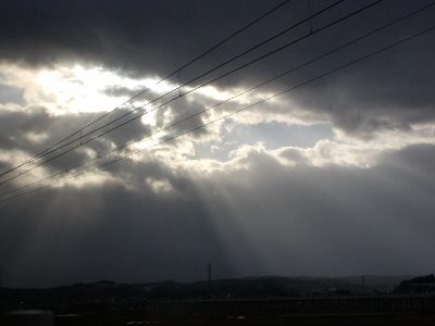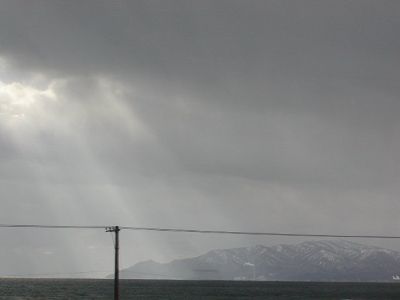 雲の切れ間から光が射し、津軽海峡の海面を照らす。