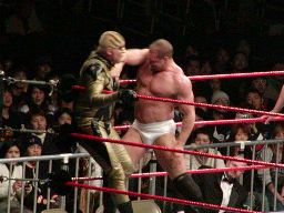 モアリーコーナーに詰めて逆水平連打(右写真)、対角線コーナーに振る、ゴールダスト切り返す、モアリーは低空ドロップキックからまたレッグロックに。ゴールダスト防戦一方。モアリーリリースしてロープに振る、ゴールダスト回転エビ固め、カウント2。パンチの打ち合い、モアリーコーナーに振って突っ込む、ゴールダストカウンターのキックからスパインバスター、そしてジャックナイフ固め、カウント2。