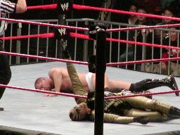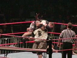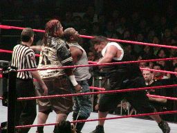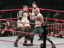 ディーボンはチョップで反撃、しかし3mwは2人攻撃、ロープを使ったサミングなどでどうしてもディーボンを解放しない。ディーボンチョップ連打(左写真)、またロージーが入ってパンチ。ロージーがコーナーにディーボンを振って突進、ディーボンロージーをかわしてジャモールにもラリアット、ようやくババレイにタッチ。