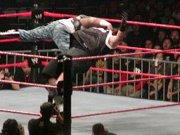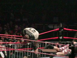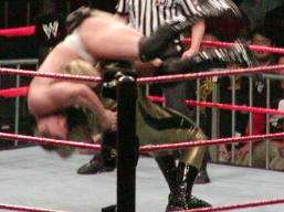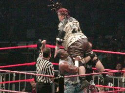 ババレイはコーナーに上ってダイビングショルダーブロック(右写真)。ロージーはジャモールにタッチ。ジャモールはパンチ攻撃でババレイを圧倒。ババレイもチョップで反撃、ジャモールコーナーに振る、ババレイ切り返して串刺しラリアット。