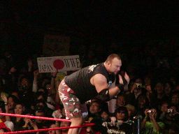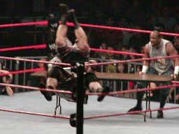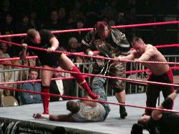 まず3-minute warningが入場。当然ブーイングの嵐。そしてダドリー・ボーイズが入場、会場今日最大の盛り上がり。この声援の多さを敏感に察知したババ・レイは長々とコーナー上でアピール(左写真)。