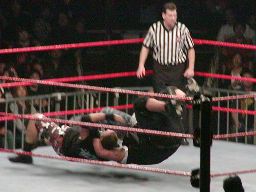 圧倒的不利になったダドリー・ボーイズにはスパイクが手助けに。ロージーをダドリードッグ、続いてジャモールにもダドリードッグ行くが(右写真)ジャモールは途中でブロックして場外に放り出す。