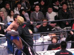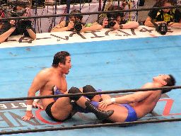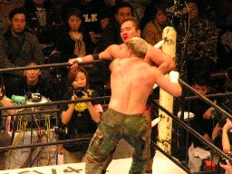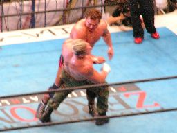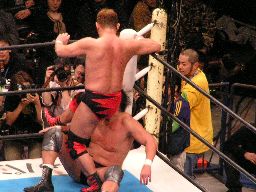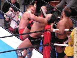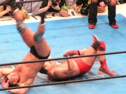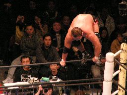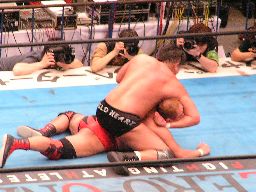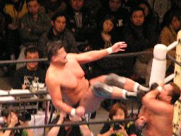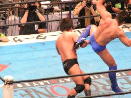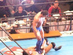 田中ロープに振る、ハワードはリープフロッグで突進かわすが田中はすくい投げからアンクルホールド、ハワードは高速匍匐前進でエスケープ。大森にタッチ。大森は田中をロープに振ってドロップキック(右写真)。5分経過。