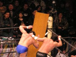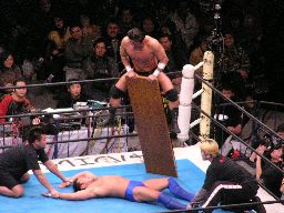 机を坂田のノドにあてがうともう一方の端をイスでがんがん打つ(左写真)。次は股間にあてがってもう一度。坂田をコーナーに振って3人で串刺し攻撃ねらうが坂田は切り返し、逆に3人をコーナーに振って串刺しニールキック。