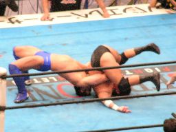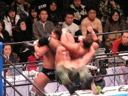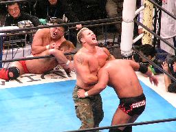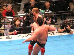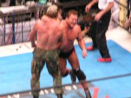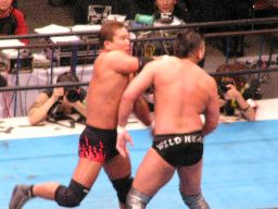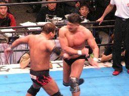 先発は田中と大森。ロックアップからヘッドロック、ロープに振ってショルダーブロック合戦、エルボーの打ち合い(左写真)。大森ビッグブーツ2発。手四つ、田中バック取る、コーナーまで押し込んで大谷にタッチ。