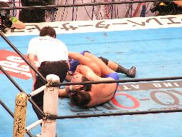 坂田張り手、サミングで黒田に反撃。黒田をコーナーに逆さ吊りにして顔面にスライディングキック狙うが黒田は腹筋で起き上がってこれをかわす。黒田は坂田の足を場外に引っ張り出して得意の足攻撃(左写真)。