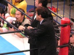 黒田コーナーに上って机ごと坂田の上に落下(右写真)。